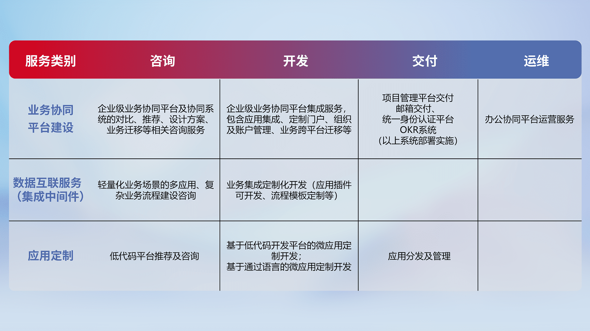 针对钉钉、、、企微、、、、IDaas等平台级产品提供产品的规划、、、方案、、交付、、定制化开发等服务,,实现如统一协同办公、、智能客户服务、、、、混合会议管理、、、、智能数据查询、、、、等业务场景,,,实现数字化转型。。。