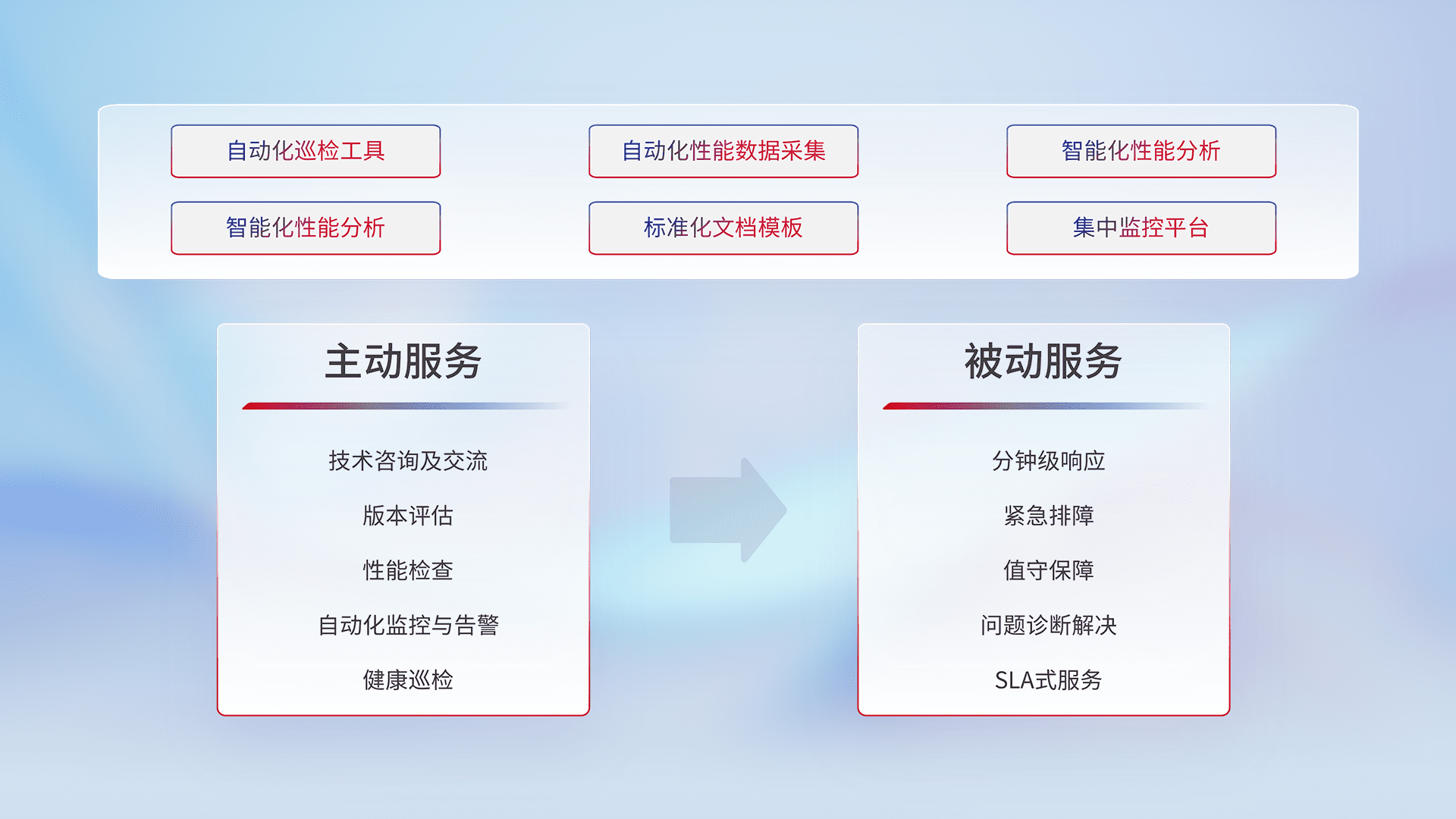 智能化工具和标准化文档,,保障服务质量,,,提供主动服务(包含技术咨询、、版本评估、、、、性能检查、、、自动化监控与告警、、、健康巡检)和被动服务包含(分钟级响应、、紧急排障、、值守保障、、、、问题诊断解决、、、SLA服务)。。。。